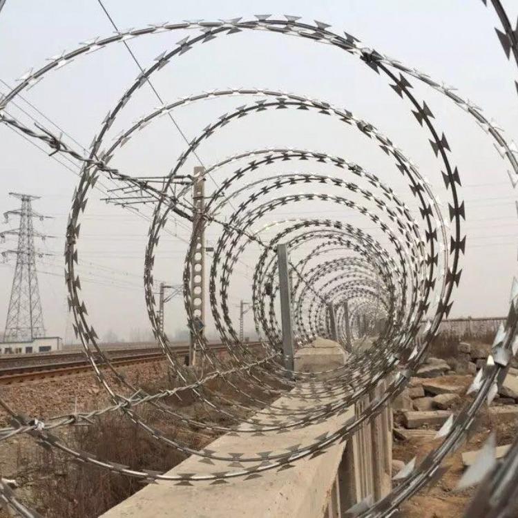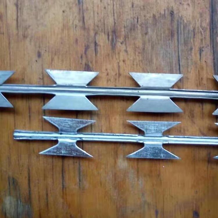(1)刺丝滚笼采用刀片刺绳绕圈后相邻两圈每隔120度用刺丝连接卡固定,张开后形成蛇腹网状,闭合后刀片刺绳卷径为50cm,张开后每交叉圈安装间距20cm,直径不小于45cm。(2)刀片刺绳由冲切钢板采用机械轧在钢丝上成型,刀刺宽度22mm,刀刃垂直间距15mm,刀刺纵向间距34mm,芯丝直径为2.5mm。刀片厚度0.5mm的Q195钢板网冲切制作。芯丝由HPB300 -6.5mm高线钢丝冷拔加工。