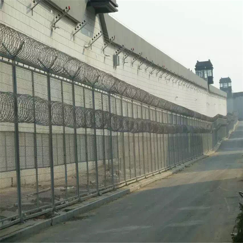 监狱钢网墙是非常重要的监狱安全防护设施,由焊接钢网加蛇腹形刀刺网组合而成。产品具有结构新颖、坚固紧密、网面平整、网孔均匀、刀锋锐利、防攀爬、抗腐蚀性强等特点。建设于看守所的内外墙地面及高墙之上,监狱护栏网内侧或顶部加装蛇腹形刀刺网,形成一道高不可攀、难以逾越的隔离障碍。配合高压打击电网、各种看守所报警设备确保监狱安全万无一失。