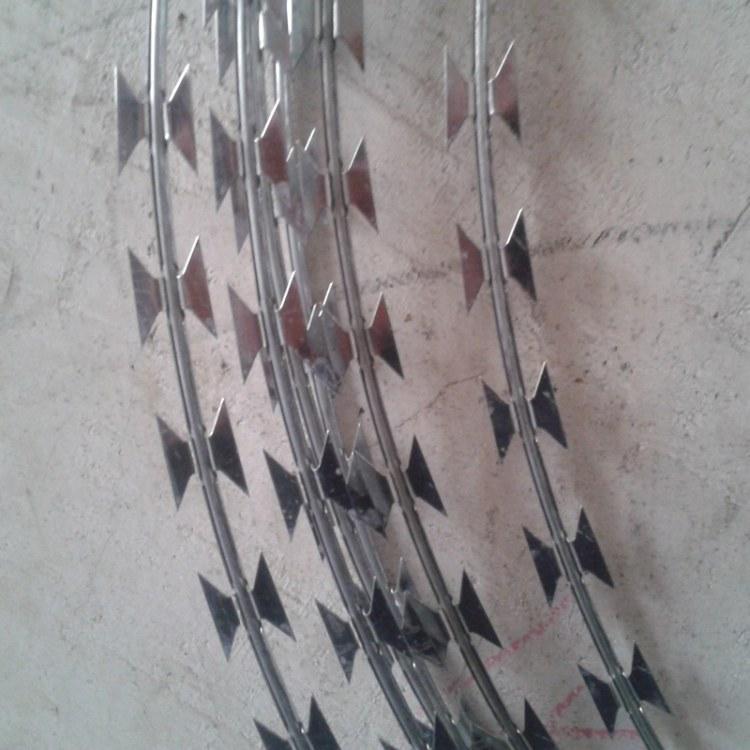 2012年最新《铁路线路防护栅栏》[通线(2012)8001]通用参考图出炉! 文献规定:铁路栅栏一改往日焊接钢丝网栅栏、刺丝网栅栏等产品,改为防御性更强、寿命更长久的:钢筋混凝土栅栏+0.5米高刺丝滚笼的防护栅栏。详细内容如下: 钢筋混凝土栅栏:详见图纸 0.5米高刺丝滚笼组成:刺丝刺绳+刀刺滚笼+钢丝+立柱 图集中:5、刺丝滚笼:(1)刺丝滚笼采用刀片刺绳绕圈后相邻两圈每隔120度用刺丝连接卡固定,张开后形成蛇腹网状,闭合后刀片刺绳卷径为50cm,张开后每交叉圈安装间距20cm,直径不小于45cm。(2)刀片刺绳由冲切钢板采用机械轧在钢丝上成型,刀刺宽度22mm,刀刃垂直间距15mm,刀刺纵向间距34mm,芯丝直径为2.5mm。刀片厚度0.5mm的Q195钢板网冲切制作。芯丝由HPB300 -6.5mm高线钢丝冷拔加工。(3)刺丝滚笼由刺丝连接卡扣与固定在支架上的纵向拉筋相连接。纵向拉筋与支架的连接采用-2.5mm的冷拔镀锌钢丝绕2圈后拧紧固定。