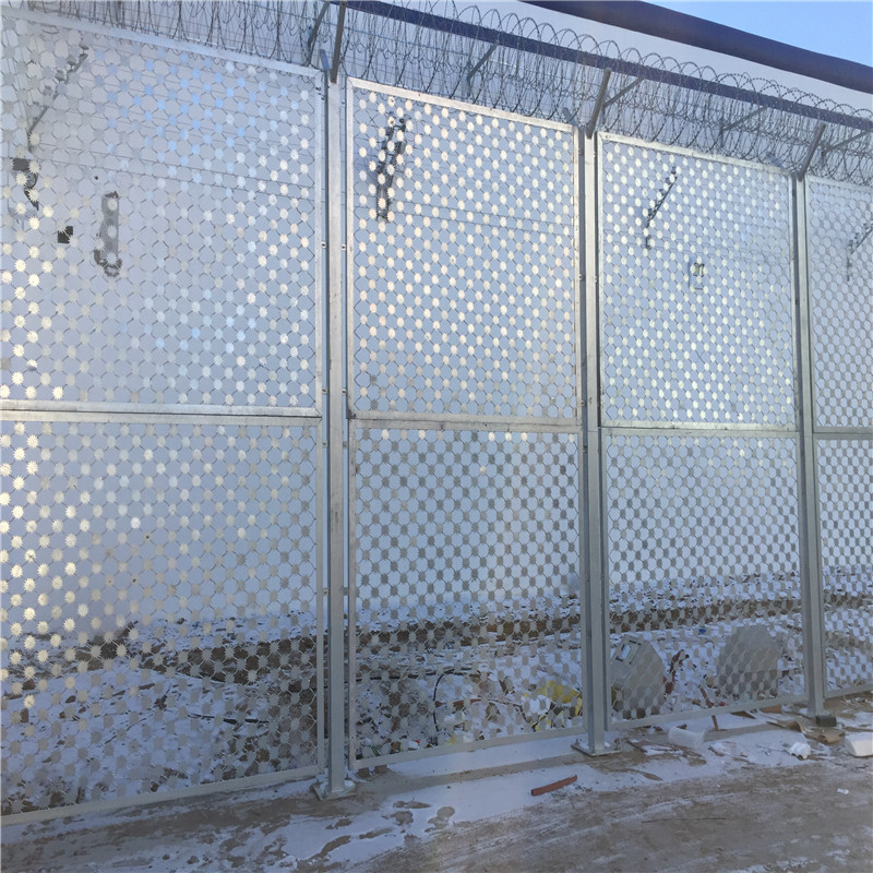 监狱护栏网是一款为高机密高安全场所设计新型护栏网,它主要是采用先进高强度的刀片刺网与优质护栏网的结合体,由V型支架立拄,加强型焊接片网,安全防盗连接件和刀片刺网组成,既安全环保又经久耐用。刀片刺网是一种新型防护网,由锐利尖角镀锌钢板或不锈钢薄板做刀片,钢丝做芯线组合而成的防护器材.监狱护栏网刀片刺网具有吓阻、防翻越等效果,材质坚硬,高强度,高张力,造型设计独特,不宜触摸,因而能达到极好的防护隔离效果,监狱护栏网采用低碳钢丝焊接而成的网片、立柱、刺铁丝(可选)、斜撑(可选)连接而成。监狱护栏网具有美观、大方、防腐性好、易保养、防攀爬能力强。主要适用于监狱,机场,军工企业周围的隔离防护,美化及防翻越工程。