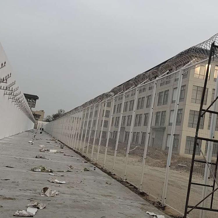 它主要是采用高强度的刀片刺绳与边框防护网的结合,由V型支架立拄,加强型焊接片网,安全防盗连接件和刀片刺绳组成.刀片刺绳是一种新型防护网,由锐利尖角镀锌钢板或不锈钢薄板做刀片,钢丝做芯线组合而成的防护器材. 监狱钢网墙刀片刺绳具有吓阻、防翻越等效果,材质坚硬,高强度,高张力,造型设计独特,不宜触摸,因而能达到极好的防护隔离效果.监狱钢网墙还具有施工简便,经济实用等优点.
