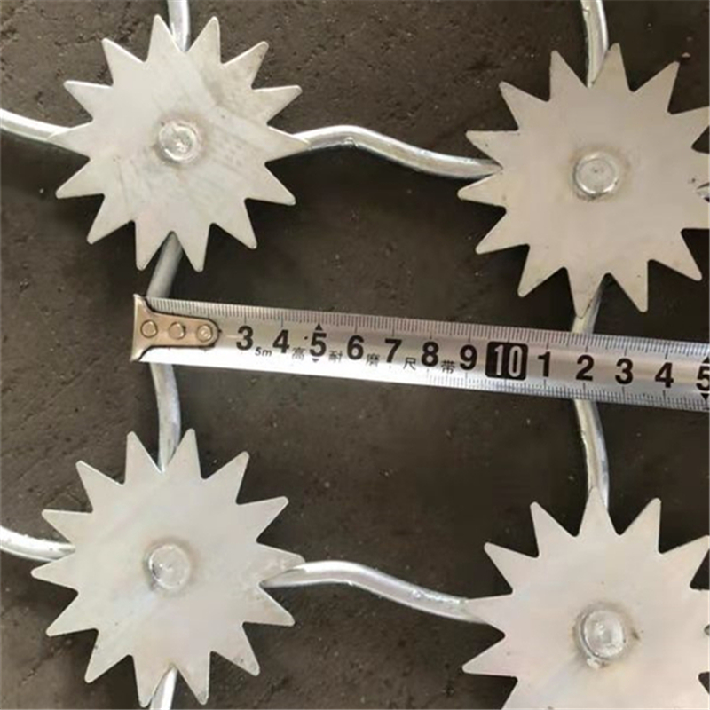 梅花刺护栏网, 主要是采用高强度的刀片刺网与普通防护网的结合,由V型支架立拄,加强型焊接片网,安全防盗连接件和刀片刺网组成。刀片刺网是一种新型防护网,由锐利尖角镀锌钢板或不锈钢薄板做刀片,钢丝做芯线组合而成的防护器材。