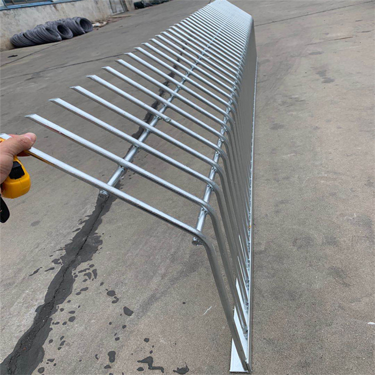 铁路防爬刺的立柱支架分为两种一种是立柱支架也叫土字型支架,一种是加密支架,这两种支架的高度一般是730MM,上边带两个挂钩。在拐角处,支架高度是1米高铁刀刺滚笼的土字型支架重量是3公斤左右,加密支架重量是1.73公斤左右,厚度都是2MM。