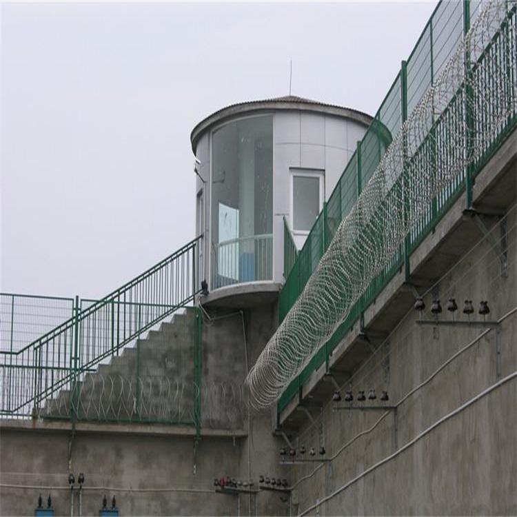 监狱防攀爬护栏网也被称监狱钢网墙,艾瑞公司专业生产监狱看守所防爬护栏网艾瑞公司生产的护栏网立柱由Y形镀锌钢管制成,钢管的壁厚为150 * 150 * 8mm,网架的尺寸为60 * 60 * 2.5m。此外,监狱防攀爬护栏网的Y形柱还配备了不锈钢刀片刺网,并对其表面进行了喷涂。常见的是深绿色喷涂和银灰色喷涂,看起来高端,简单而美丽,并且可以起到防腐防锈的作用,还可以起到装饰环境的作用。下面就来介绍一下监狱防攀爬护栏网的特点以及结构规格。