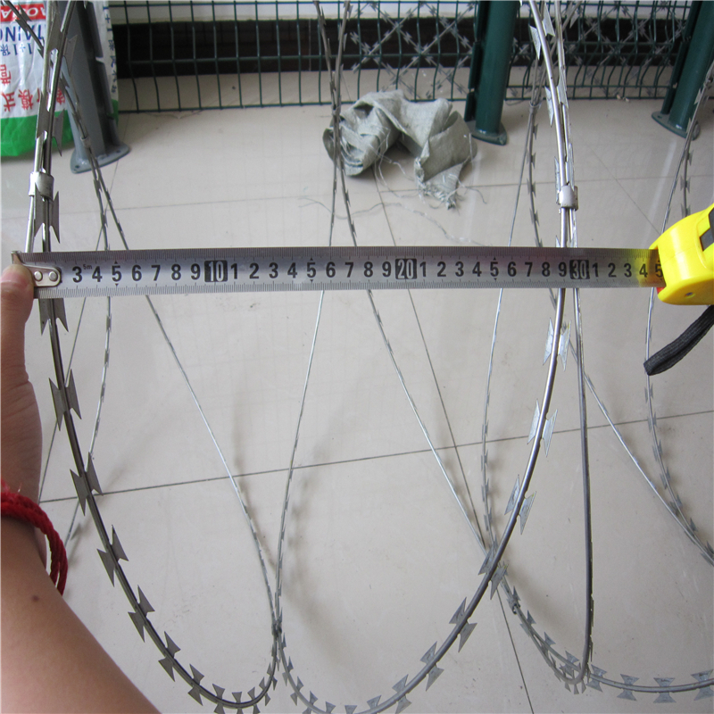 (1)、高铁刺丝滚笼采用刀片刺绳绕圈后相临两圈每隔120°用刺丝连接卡固定,张开后形成蛇腹网状,闭合后刀片刺绳圈径为50cm,张开后每交叉圈安装间距20cm,直径不小于45cm。