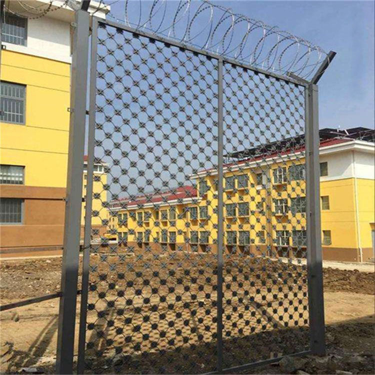 监狱护栏网大门,刀片刺网大门,梅花刺网大门,监狱防护网是非常重要的监区安全防护设施,是由焊接钢网加蛇腹形刀刺网组合而成。产品具有结构新颖、坚固紧密、网面平整、网孔均匀、刀锋锐利、防攀爬、耐腐蚀性强等特点。Y型架上边架蛇腹型刀刺:由热镀锌钢板或不锈钢薄板冲压出尖利的刀片状,高张力镀锌钢丝或者不锈钢丝做芯线组合而成的阻尽器材。刀刺直径采取50或60厘米,刀型整洁、刀片锋利、排列均匀致密、连接坚固、防腐才能强,可能达到防擎越、防拆卸更高保险等级。