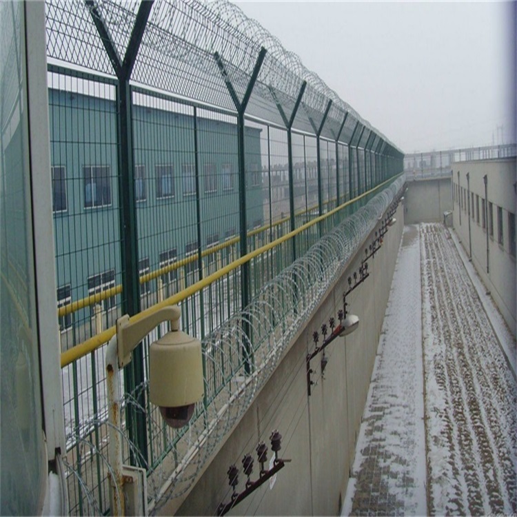 近年来,被广泛应用在监狱,军事基地等高安全场所。注:如果在监狱护栏网顶部加装刀片刺丝、刀片刺绳后又很好的增强了安全防护性能。