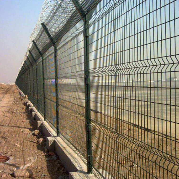 机场围界围栏网一般顶端都设有V型支架与立柱焊接。材料通常选择和立柱同等材料或者稍小规格材料搭配使用。V型支架的加装是为了将蛇腹形刀刺网固定在围界网顶部,从而有效的增加机场围界网的防攀爬性和安全性。