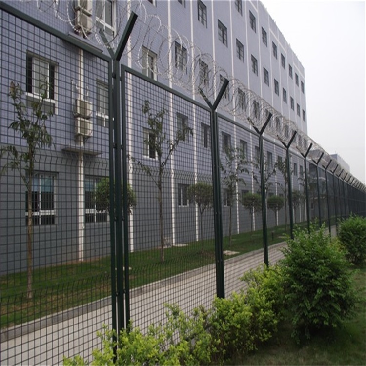 近年来,被广泛应用在监狱,军事基地等高安全场所。注:如果在监狱护栏网顶部加装刀片刺丝、刀片刺绳后又很好的增强了安全防护性能。