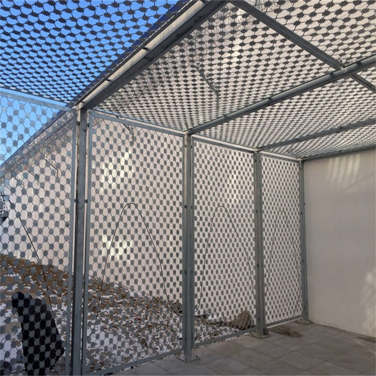监狱放风场隔离网、 监狱防御隔离网、 防攀爬隔离网、监狱刀片刺网隔离网主要用于园林公寓、机关单位、监狱、哨所、边防等的圈禁防护。刀刺隔离网由锐利尖角镀锌钢板或不锈钢薄板做刀片,高张力钢丝做芯线组合而成的阻绝器材。由于刀片刺绳隔离网造形独特不易触摸,因而能达到很好的防护隔离效果。直线形刀片刺网由刀片型直线刺网交叉焊接成型,可用于防盗窗、高速护栏、隔离栅。施工迅速、效果显著。刀刺隔离网,有多种架设方式可供选择,施工迅速,既省经费,又可达到安全隔离网效果。