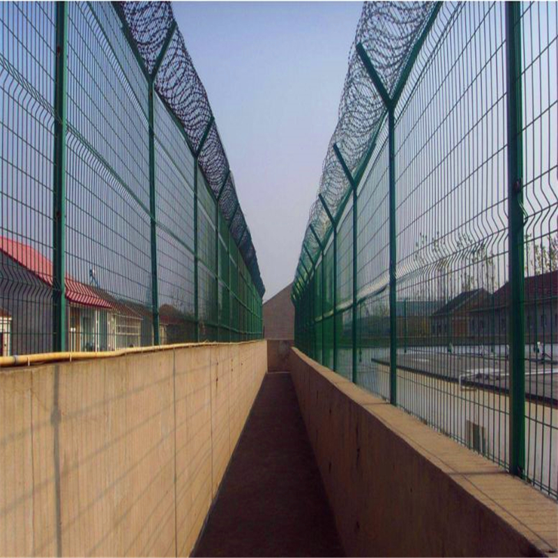 监狱护栏网又称监狱钢网墙,防攀网,监狱防护网等,主要是采用高强度的刀片刺网与普通防护网的结合,由V型支架立拄,加强型焊接片网,安全防盗连接件和刀片刺网组成。材质一般选用铝镁合金丝或是低碳钢丝。