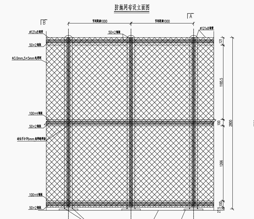 3.防批网网片应选用冷拔低碳钢丝制作,网丝直径3mm,网孔5x5mm