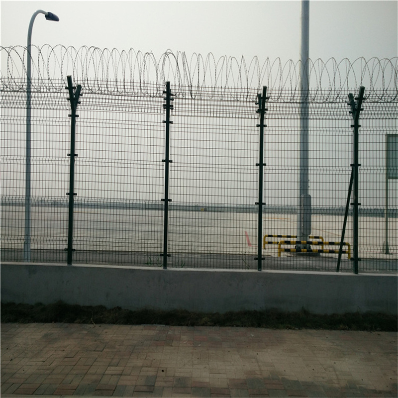 机场网围栏规格最常见的是:钢筋网片一般为墨绿色,外形尺寸2*3m,网孔5*50cm,丝径5mm,上端有V型支架用来固定刀刺滚笼,加强二次防护功能。机场护栏网立柱采用80*60*6mm矩形钢管,预埋0.5m左右,整体进行热镀锌和热浸塑处理,防腐功能强、使用寿命长,是使用量最广泛的机场围界样式。