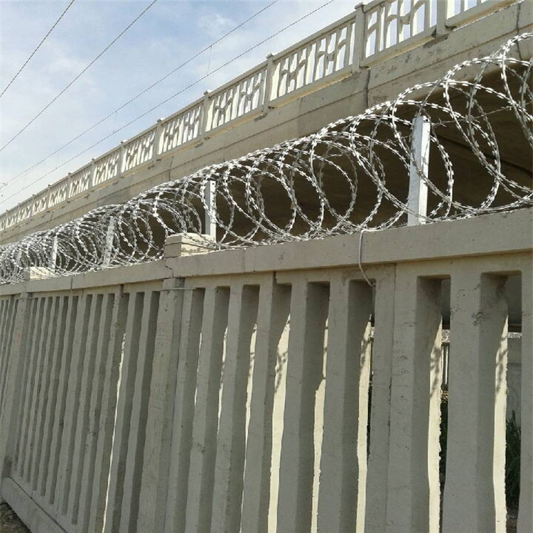 铁路刺丝滚笼防护栅栏主要包括刀片剌网,刺绳,和支架及卡扣等。安装好后具有很好的阻吓效果,与能起到相同作用的产品比起来性价比是高很多的。主要制作工艺就是由热镀锌钢板或者不锈钢钢板冲压出尖锐的刀片,然后由高张力镀锌钢丝或者不锈钢丝来做芯线组合构成的防护产品。配合立柱支架、加密支架、台阶支架安装在水泥立柱上起到固定的作用,一般间隔3米安装一个。