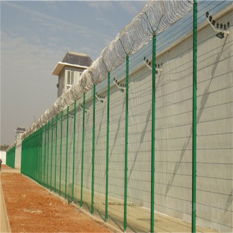 2. 结构:为保证足够的安全性,监狱金属钢网墙一般采用框架结构,边框可使用方管、圆管或角钢,立柱采用Y型立柱,立柱规格选用60×60mm;80×80mm等,顶部安装防爬刀刺网,常用圈径500mm;600mm,材质为304不锈钢。