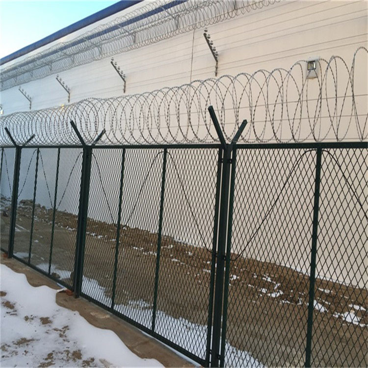 监狱隔离网立柱间距为3米,边框为30X30mm或者30X50mm的钢管,网孔为:70x150mm、50X100mm、60X120mm等,丝径为:4mm-6mm;立柱规格为:60X60mm、80X80mm、100X100mm方柱,V字高度为:50cm,立柱壁厚: 2mm-3.5mm;整体全部采用镀锌材质浸塑或者静电喷涂。连接方式网片边框打孔。立柱焊接边耳用镀锌或不锈钢螺丝连接。监狱隔离网立柱顶部加焊V型网片,用来支撑蛇腹型刀刺网,这样组装起来的监狱隔离网坚不可摧。