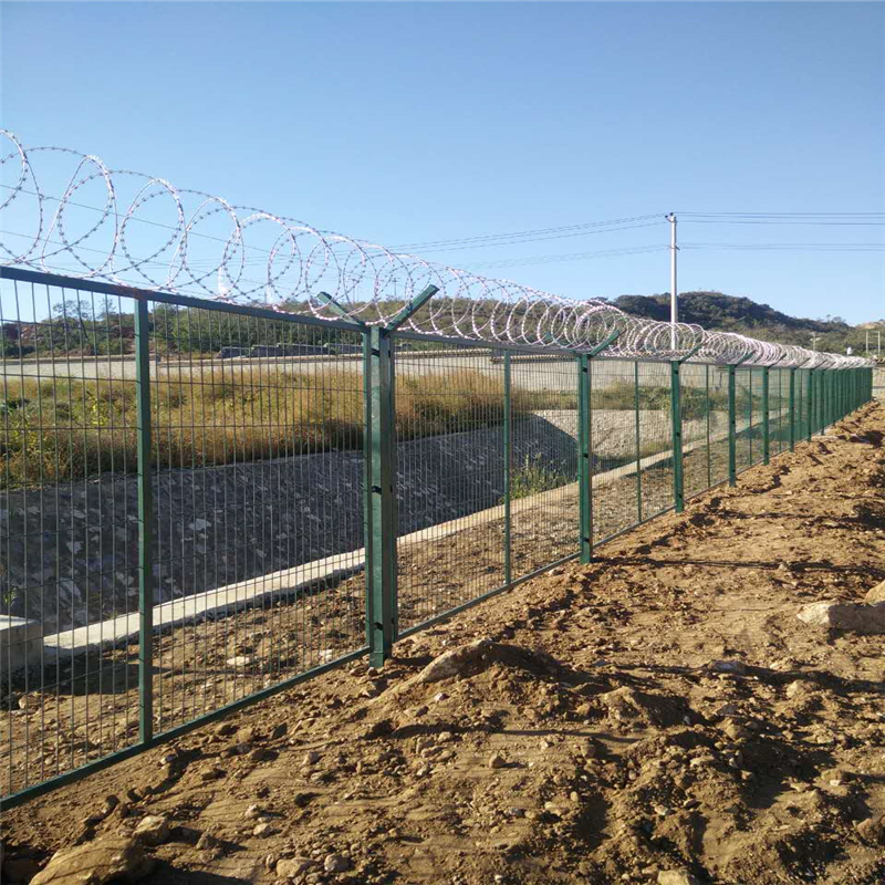 主要是采用高强度的刀片刺网与普通防护网的结合,由V型支架立拄,加强型焊接片网,安全防盗连接件和刀片刺网组成.刀片刺网是一种新型防护网,由锐利尖角镀锌钢板或不锈钢薄板做刀片,钢丝做芯线组合而成的防护器材.