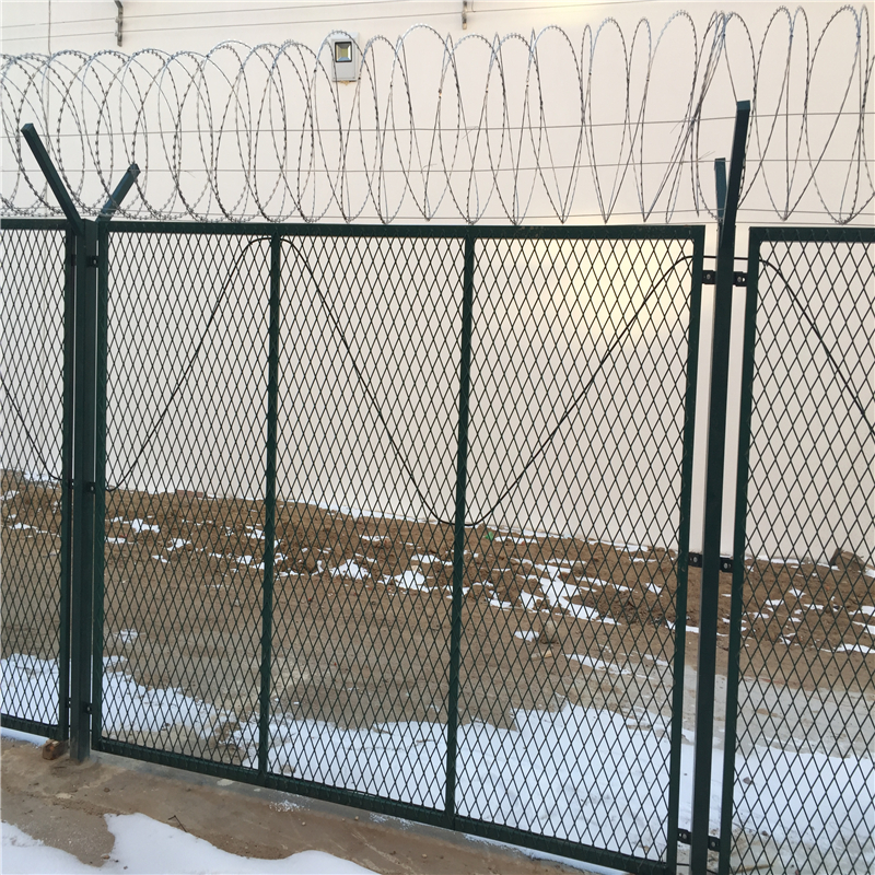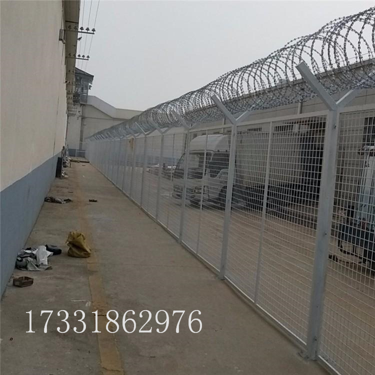 监狱护栏网又称作“Y型安全防御护网”,是由V型支架立柱,加强型焊接片网,安全防盗连接件和热镀锌刀片刺笼组成强度和安全防御性级别很高。近年来,被广泛应用在监狱,军事基地等高安全场所。注:如果在监狱护栏网顶部加装刀片刺丝、刀片刺绳后又很好的增强了安全防护性能。采用电镀、热镀、喷塑、浸塑等防腐形式,具有很好的抗老化、抗晒、耐候等特点。其产品造型美观、花色多样,既起到围栏作用,又起到美化作用。由于具有安全性高、防攀爬能力好,网片连接方式采用特制SBS紧扣件,有效防止人为的破坏性拆卸,横向四道折弯加强筋,使网面强度显著增加。