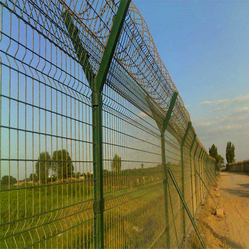 机场围界,主要用于机场的保护。主板和V板采用4.0mm/5.0mm低碳钢线材焊接。机场围界的表面处理是镀锌+静电聚酯粉末涂覆或镀锌+ PVC涂布。在每个2.5m的间隔内,使用600毫米V形方形管道连接网片。机场的隔离网上方加上刀片刺绳将更加安全。