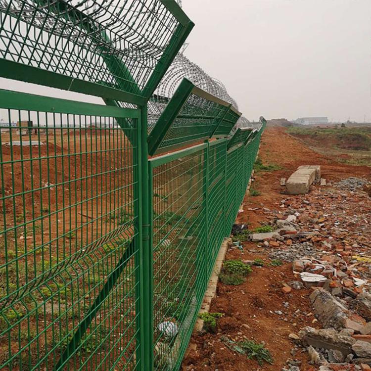 机场围界是由Y型立柱、加强型焊接网片、安全防盗连接件和热镀锌刀刺滚笼组成安全防御性级别很高的隔离网产品。机场围界表面采用电镀、热镀、喷塑或浸塑等防腐形式,具有良好的抗腐蚀、抗晒、抗老化的优点。其造型美观,既安全作用又有美观作用。被广泛应用在机场、监狱、军事基地等高安全场所。