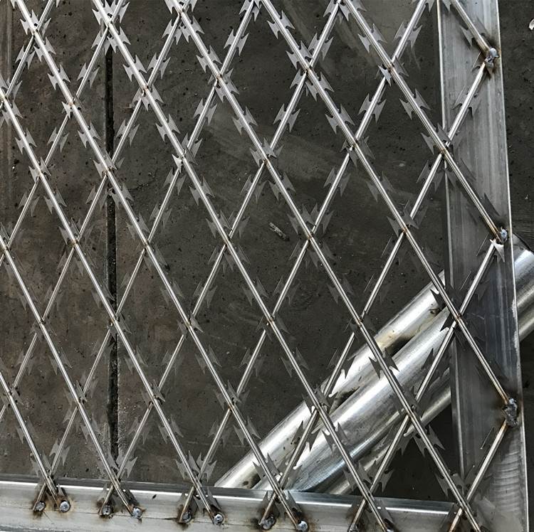 固定支架是我们加工好的,底部有固定底座。使用手持式固定钻把支架固定在需要的合适位置,一般相隔2.5m或者3m固定一个。接下来就是把拉线设置好,每个支架的单臂上面有固定点,每侧可设置两道或者三道。拉线固定就是刀片刺网了,刀片刺网拆下包装带好防护手套,根据自己需要的密度把刀片刺网放在固定拉线上面,用镀锌卡扣固定好。以上就是所有的安装步骤及方法。