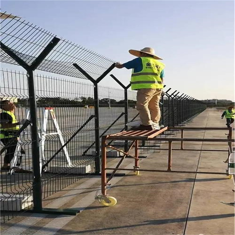 标准的机场围界采用直径5.0mm优质低碳钢丝焊接,网孔50mm*100mm,50*200mm,也可根据要求定做。Y型安全防御护网所用的立柱为60X60的矩形钢或圆管立柱,顶端焊有V型支架,也可采用70mmX100mm的挂式连接立柱。产品均为热镀锌后采用高质量的聚酯粉末静电喷涂,采用国际流行的RAL颜色。连接方式主要使用M卡,抱卡连接,表面处理常用热镀、喷塑、浸塑,常见颜色为绿色。具有美观、实用、方便运输和安装的特点,安装时还能适应地形,与立柱连接位随地面起伏可上下调整。