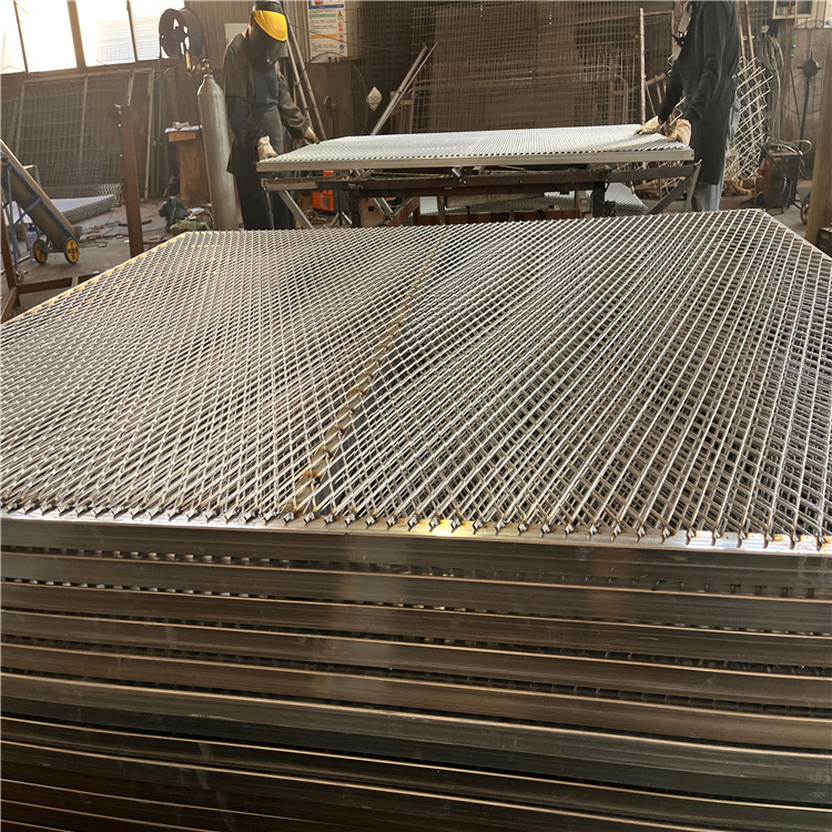 3.钢板网制作:把成品板经过机器冲剪拉伸成带有菱形孔状的钢板网,厚度、孔径大小按要求,然后焊接在焊接好的边框上面。