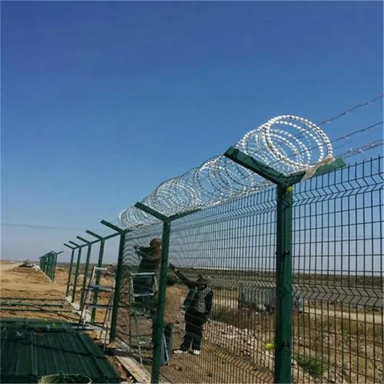 常用规格:整体高度2.5米,宽度3米,立柱采用60×60mm方管或圆管,网片采用4.0-6.0mm低碳钢丝焊接,网孔一般为50×100mm,50×200mm及60×120mm等。表面处理一般采用镀锌+喷塑的双层防腐处理方式,一般每6米或者9米设置一根斜撑来增加稳固性。根据安全防护的等级,机场围界的规格参数是可以调整的,机场最外围的隔离网规格参数可以下调,还有就是根据预算来调整。飞行区技术等级不同的机场,围界技术标准应有所区别,支线机场和通用航空机场若地处村落地带时,建议可以采用刺铁丝网,编织网等造价低防腐年限在5年左右的围界;在人口较为稠密的地区,飞行区围界的安全等级和使用寿命的要求则应提高。