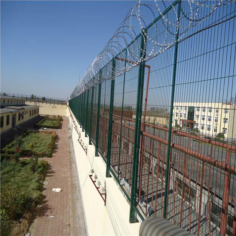 监狱隔离网又称作“Y型安全防御护网”,是由V型支架立柱,加强型焊接片网,安全防盗连接件和热镀锌刀片刺笼组成强度和安全防御性级别很高。近年来,被广泛应用在监狱,军事基地等高安全场所。注:如果在监狱护栏网顶部加装刀片刺丝、刀片刺绳后又很好的增强了安全防护性能。采用电镀、热镀、喷塑、浸塑等防腐形式,具有很好的抗老化、抗晒、耐候等特点。其产品造型美观、花色多样,既起到围栏作用,又起到美化作用。由于具有安全性高、防攀爬能力好,网片连接方式采用特制SBS紧扣件,有效防止人为的破坏性拆卸,横向四道折弯加强筋,使网面强度显著增加。