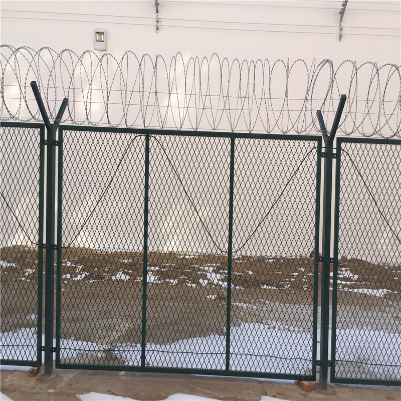 监狱护栏网又称作"Y型安全防御护网"和机场护栏网通用,是由V型支架立柱,加强型焊接片网,安全防盗连接件和热镀锌刀片刺笼组成强度和安全防御性级别很高。近年来,被广泛应用在监狱,军事基地等高安全场所。注:如果在监狱护栏网顶部加装刀片刺丝、刀片刺绳后又很好的增强了安全防护性能。采用电镀、热镀、喷塑、浸塑等防腐形式,具有很好的抗老化、抗晒、耐候等特点。其产品造型美观、花色多样,既起到围栏作用,又起到美化作用。由于具有安全性高、防攀爬能力好,网片连接方式采用特制SBS紧扣件,有效防止人为的破坏性拆卸,横向四道折弯加强筋,使网面强度显著增加。