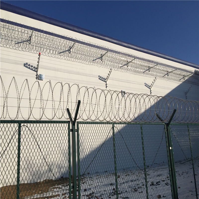 监狱钢网墙如果在顶部加装刀片刺丝、刀片刺网后又很好的增强了安全防护性能。采用电镀、热镀、喷塑、浸塑等防腐形式,具有很好的抗老化、抗晒、耐腐蚀等特点。其产品造型美观、花色多样,既起到围栏作用,又起到美化作用。由于具有安全性高、防攀爬能力好,网片连接方式采用特制SBS紧扣件,有效防止人为的破坏性拆卸,横向四道折弯加强筋,使网面强度显著增加。