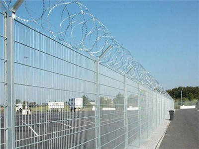 6、特点:如果在机场护栏网顶部加装刀片刺丝、刀片刺绳后又很好的增强了安全防护性能。采用电镀、热镀、喷塑、浸塑等防腐形式,具有很好的抗老化、抗晒、耐候等特点。其产品造型美观、花色多样,既起到围栏作用,又起到美化作用。由于具有安全性高、防攀爬能力好,网片连接方式采用特制SBS紧扣件,有效防止人为的破坏性拆卸,横向四道折弯加强筋,使网面强度显著增加。
