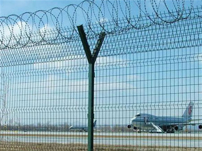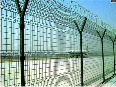 机场护栏网又称作“V型/Y型安全防御护网”,是由V型/Y型支架立柱加强型焊接片网,安全防盗连接件和热镀锌刀片