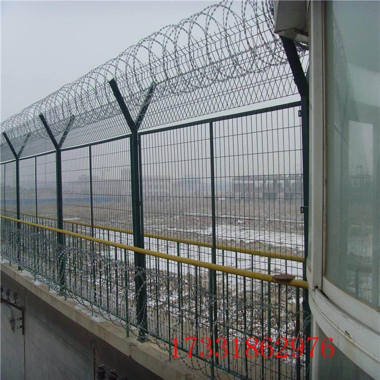 监狱围栏 看守所围栏网 监狱隔离网是一种新型防护网,由锐利尖角镀锌钢板或不锈钢薄板做刀片,钢丝做芯线组合而成的防护器材该产品具有吓阻、防翻越等效果,材质坚硬,高强度,高张力,造型设计独特,不宜触摸,因而能达到极好的防护隔离效果。还具有施工简便,经济实用等优点。